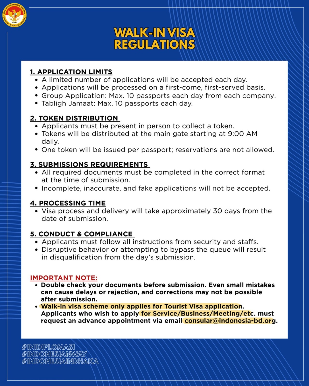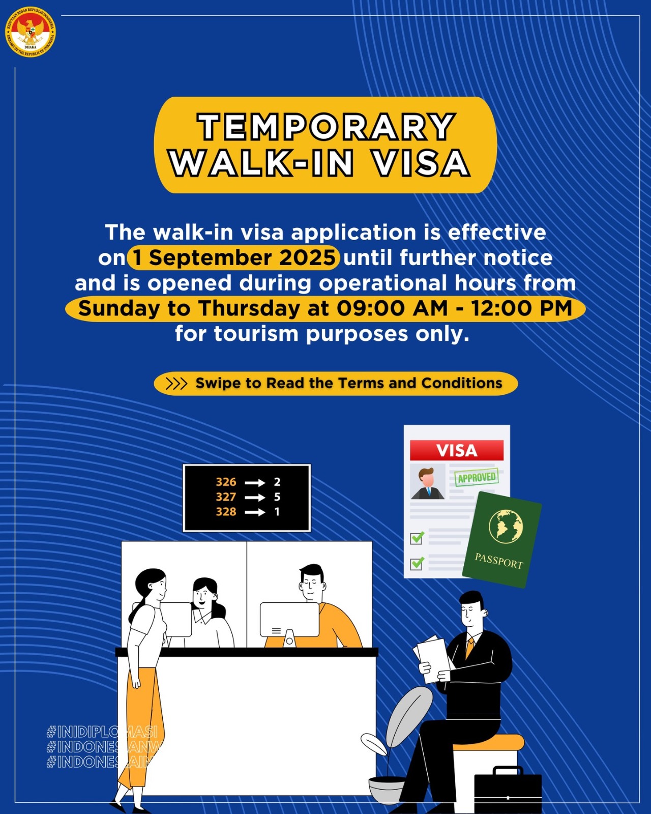 The Embassy of the Republic of Indonesia in Dhaka has launched a temporary walk-in scheme for single-entry tourist (C1) visas, effective 1 September 2025. The walk-in window runs Sunday to Thursday, 09:00–12:00, and operates on a token system issued at the main gate. Applicants must be present in person to collect a token; one token is issued per passport and reservations are not permitted.