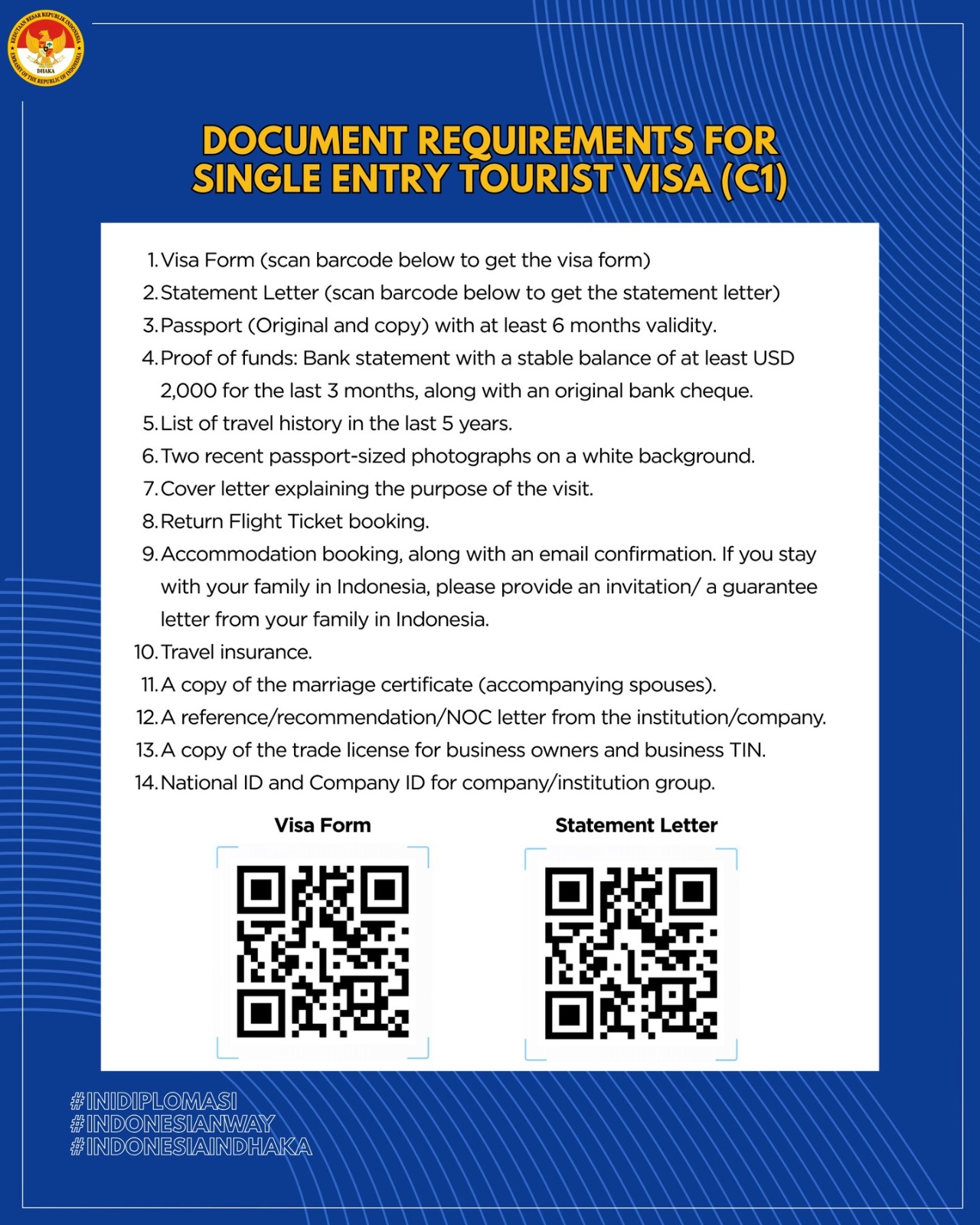 • Visa form and statement letter (available via the QR codes on the embassy notice).