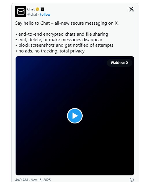 X, the social media platform formerly known as Twitter, is finally switching on its long-promised Chat feature to replace traditional direct messages. The new system is being rolled out to users as an all-in-one inbox with end-to-end encryption for one-to-one conversations. Chat also brings modern messaging tools that rival dedicated apps, including voice and video calling, file sharing and disappearing messages. For a service that has leaned heavily on real-time posts and public replies, it is a significant expansion into private communication.